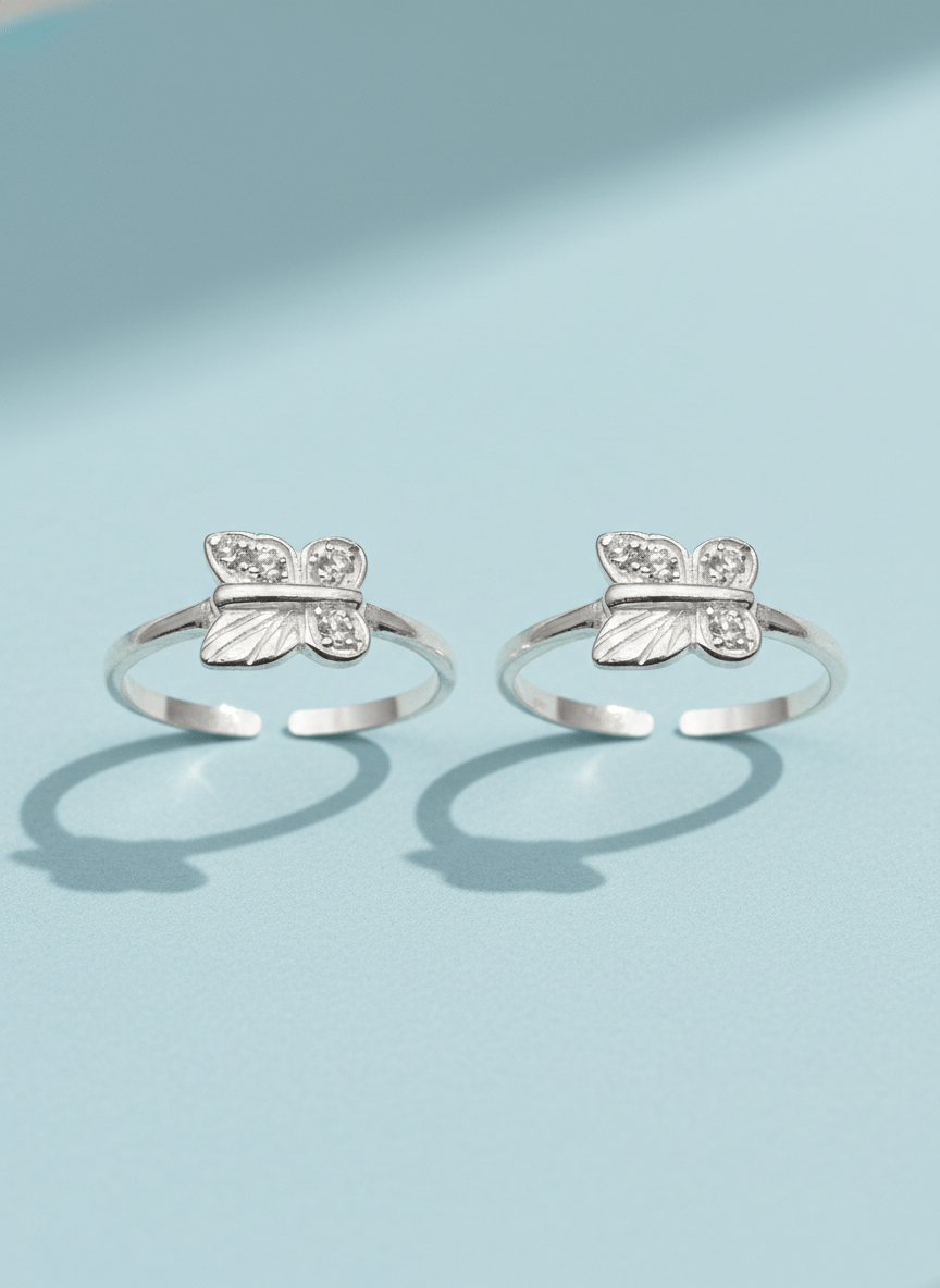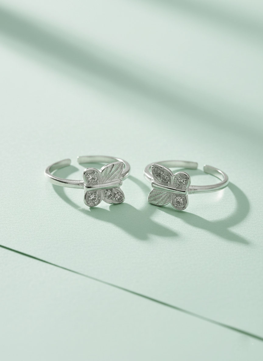 Add a playful touch to your look with these butterfly toe rings featuring a cute, detailed butterfly motif at the center. The open, adjustable band makes them easy to wear on different toes and comfortable for daily use. Ideal for women and girls who love dainty, stylish accessories, these toe rings pair beautifully with both ethnic and western outfits. Style them for casual outings, festive occasions, beachwear, or as a thoughtful gift for someone who loves butterfly-themed jewellery.