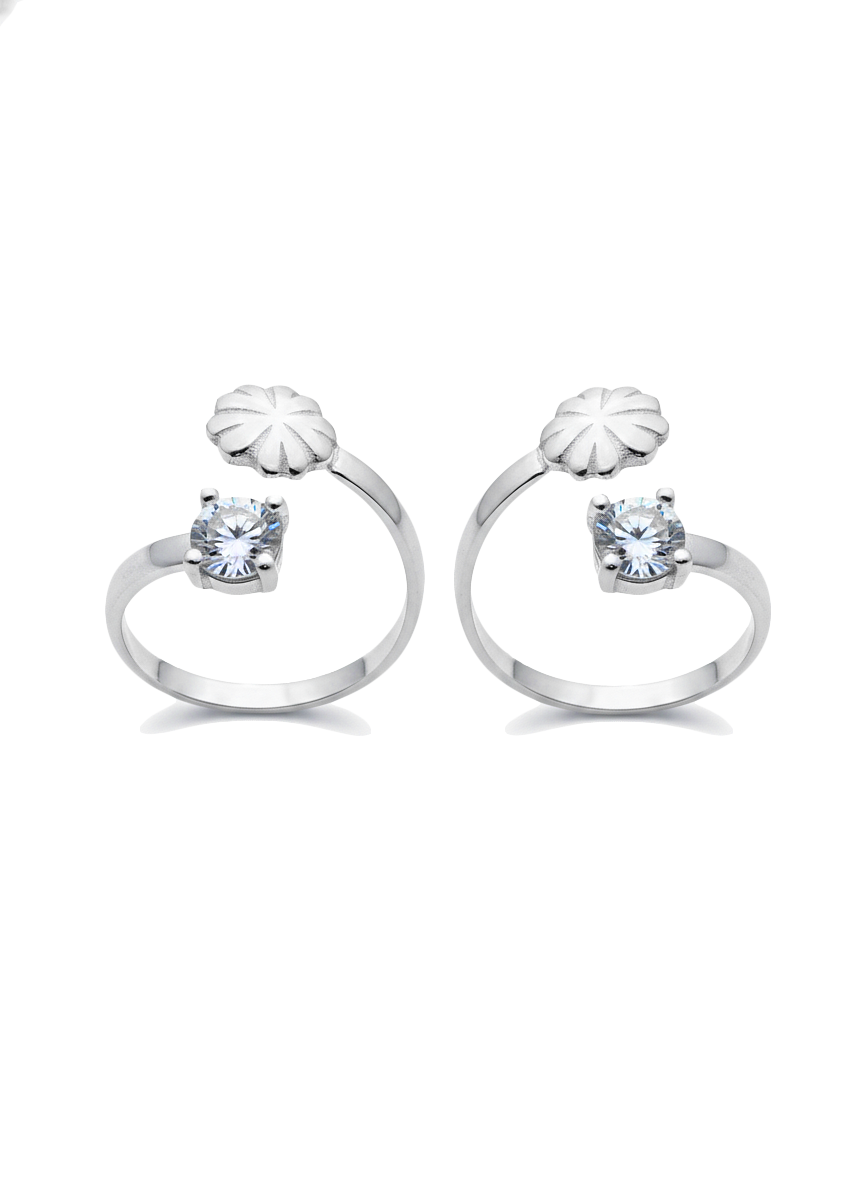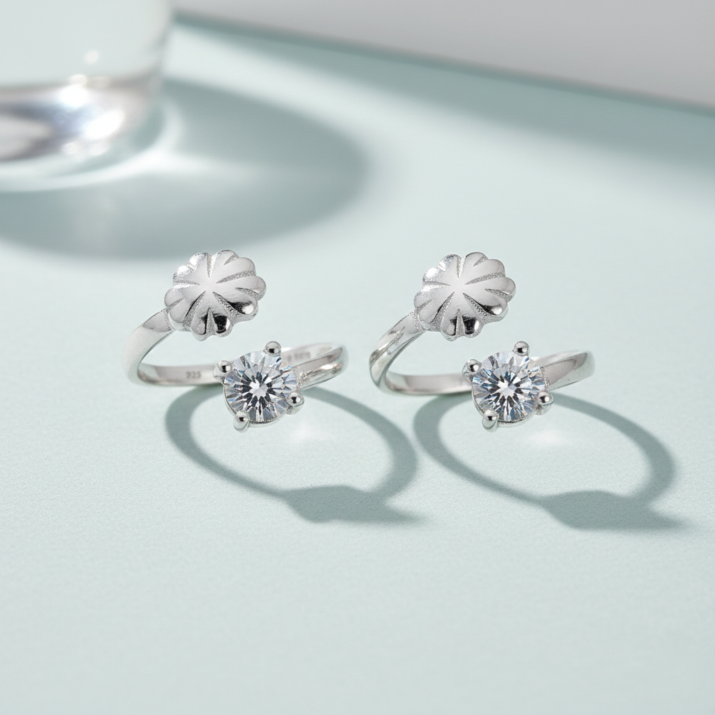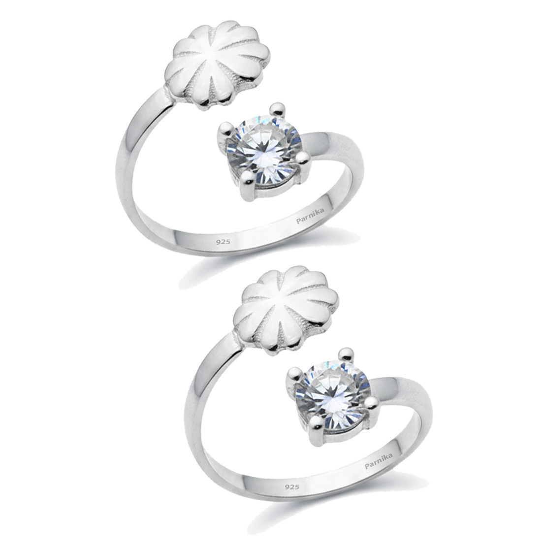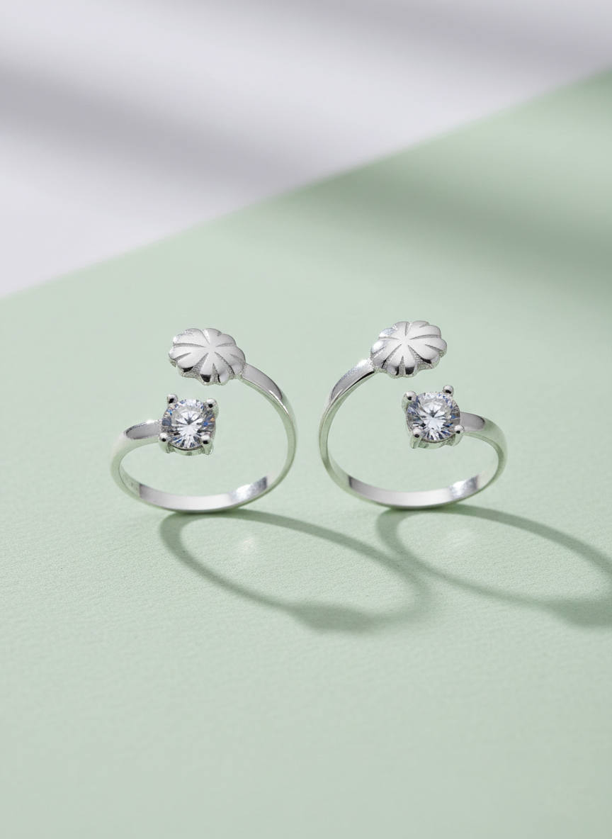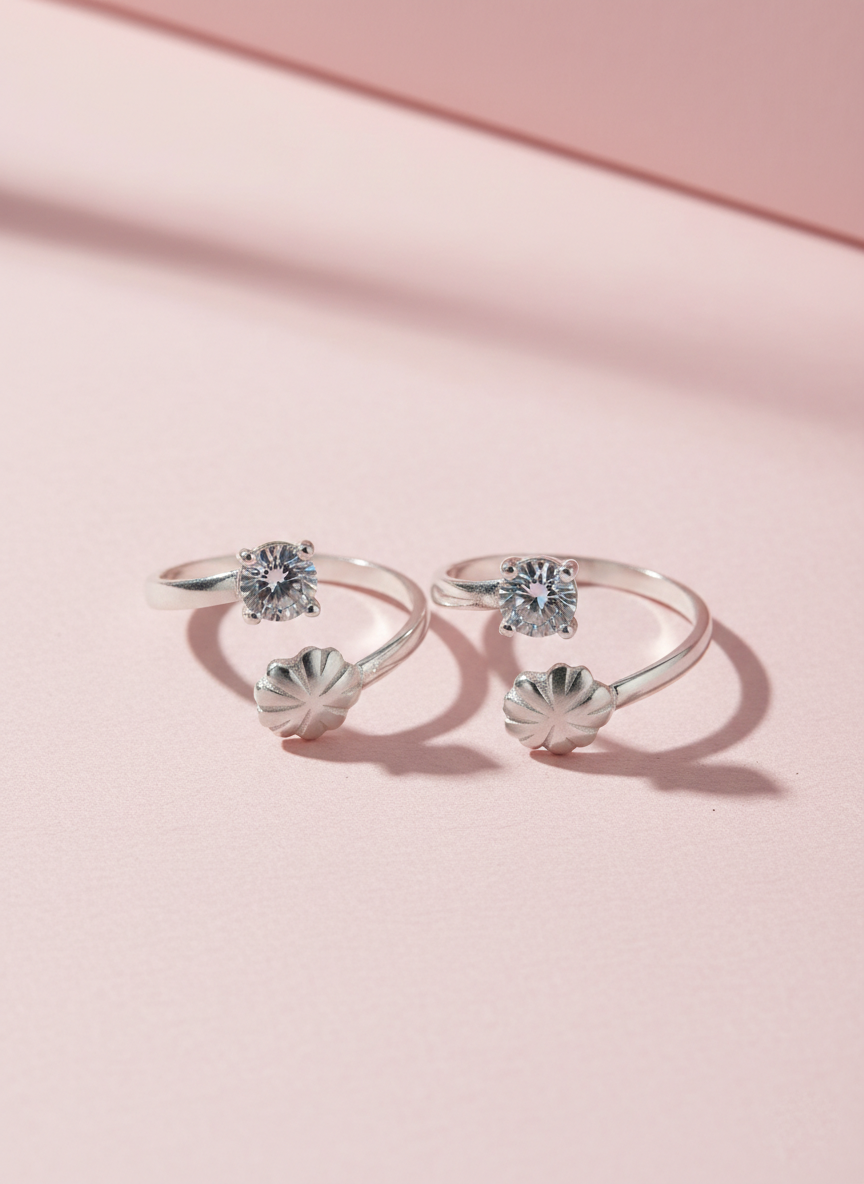 These CZ floral top open toe rings are designed to add a soft, feminine sparkle to your everyday style. The delicate floral motif is set with bright cubic zirconia stones that catch the light beautifully without looking too flashy. The open, adjustable band makes them easy to fit on most toe sizes and keeps them comfortable even when worn for long hours. You can pair them with kurtis, sarees, dresses, or casual jeans and sandals — the simple silver finish blends easily with both ethnic and western outfits. They also make a lovely, budget-friendly gift choice for birthdays, anniversaries, and festive occasions.