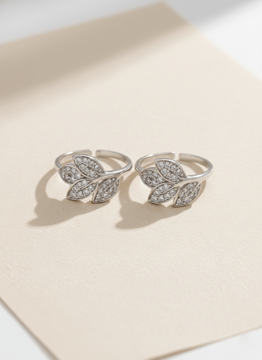 These CZ leaf design toe rings feature a graceful leaf motif paved with cluster-set stones that catch the light from every angle. The open, adjustable band lets you gently tighten or loosen the fit so you can wear them comfortably on different toes. Their delicate look makes them perfect for everyday wear, festive outfits or gifting to someone who loves minimal yet eye-catching jewellery. Pair these CZ leaf design toe rings with matching anklets or rings from our collection to complete your look.