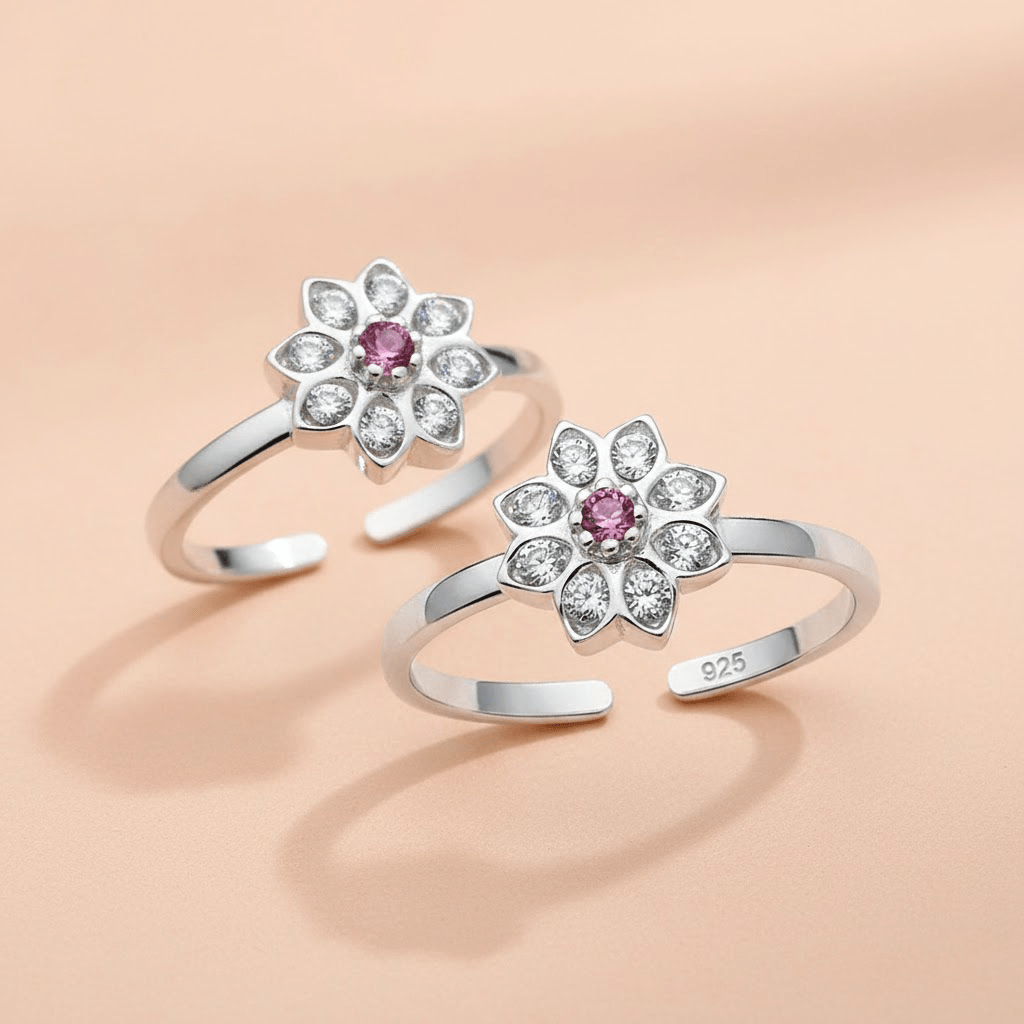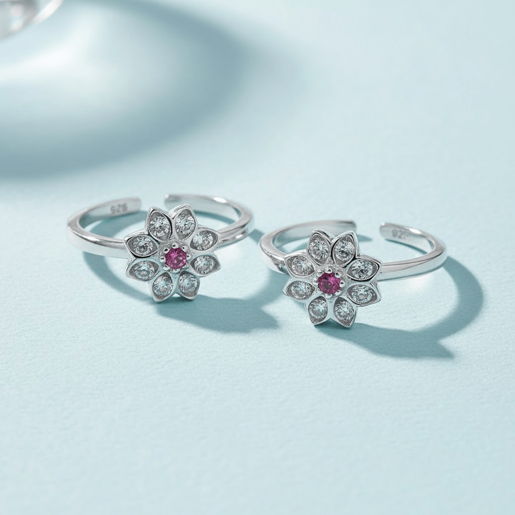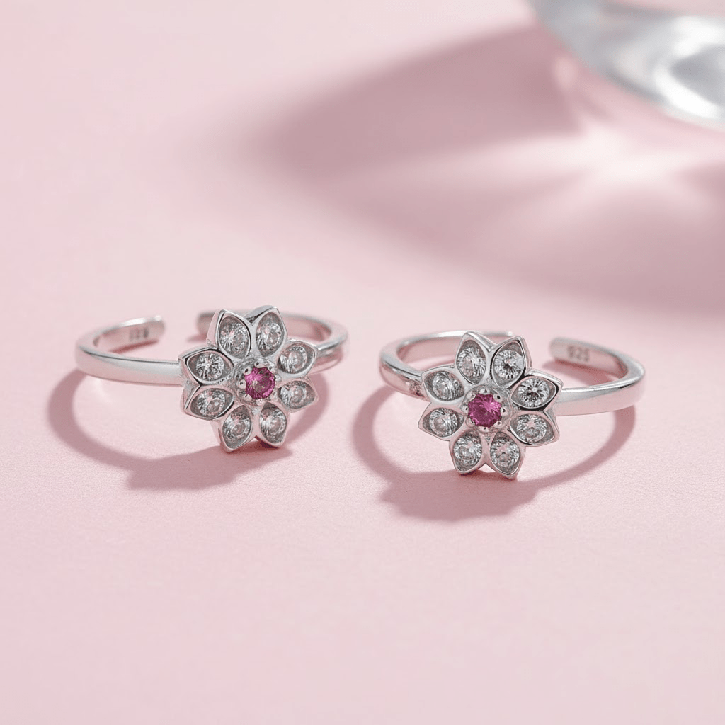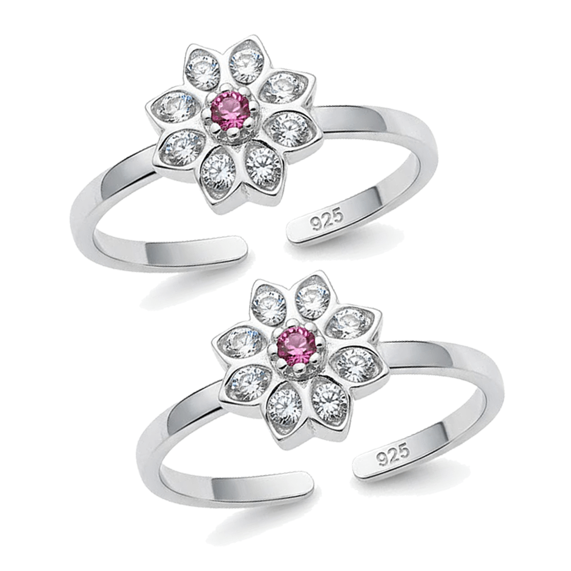 Elegant floral adjustable toe rings pair featuring a stunning pink center stone adorned with white CZ petal design. Perfect for adding a touch of grace and sparkle to your feet. The adjustable design ensures a comfortable fit for all sizes. Ideal for occasions, gifting, or everyday elegance.