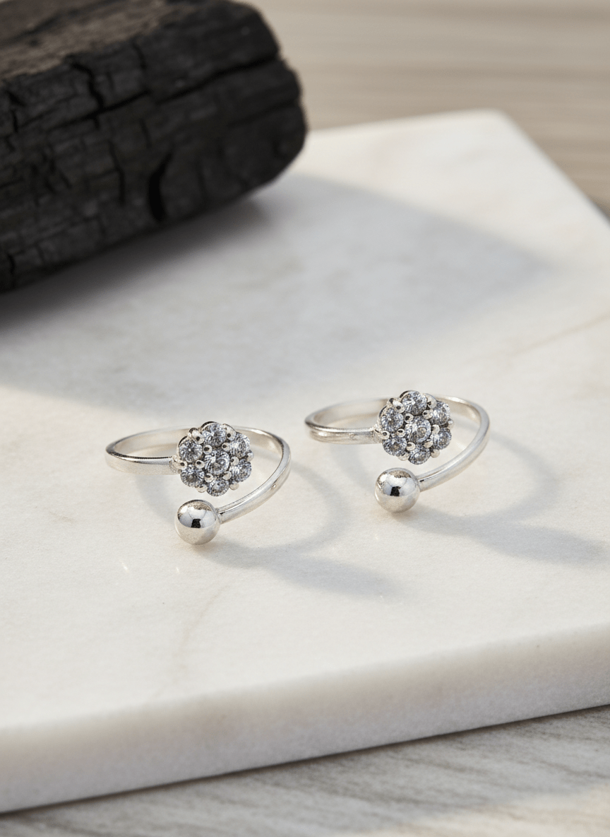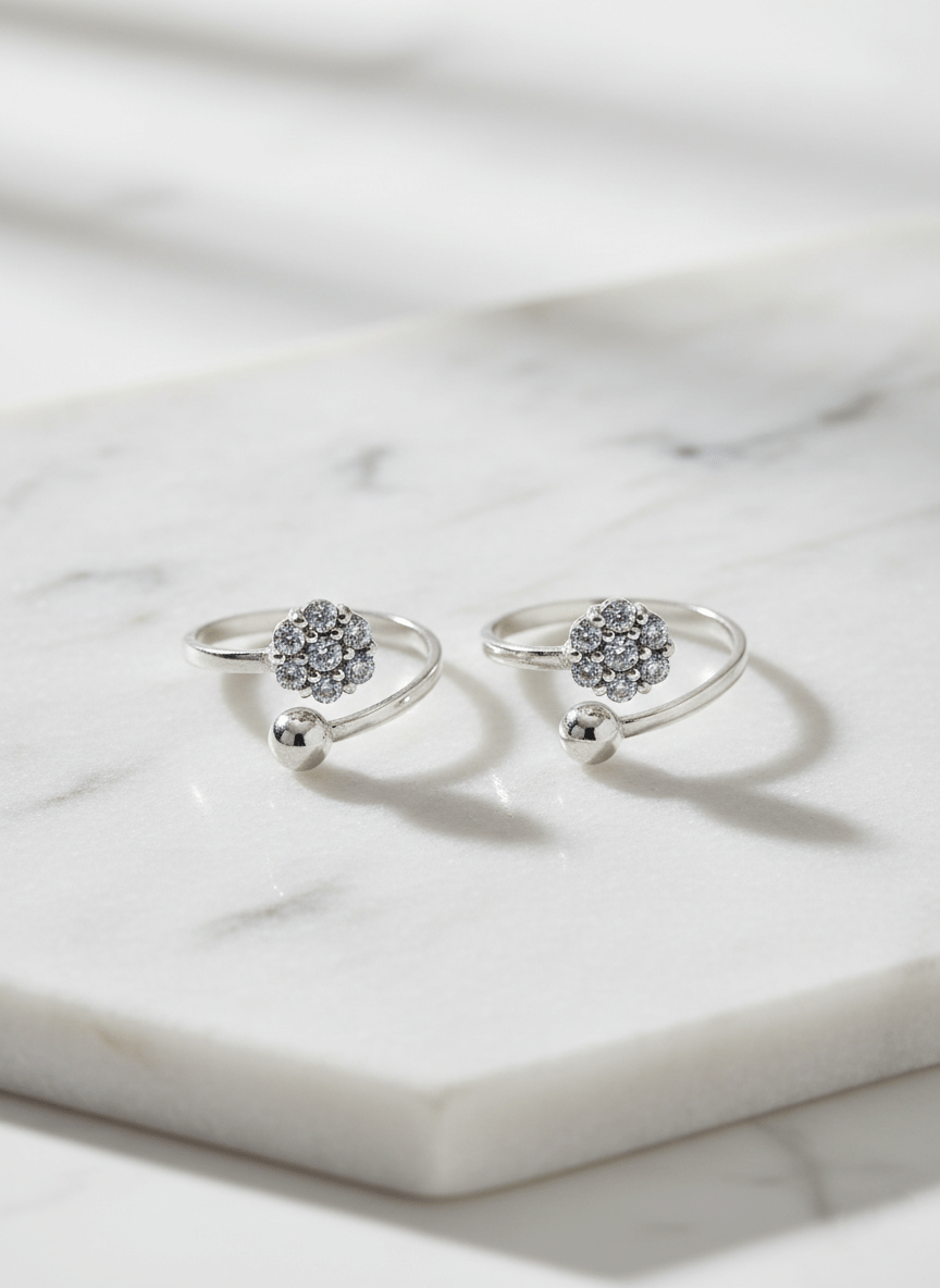 1. Floral Cluster Design: The toe rings showcase a beautiful cluster of CZ stones arranged in a flower-like pattern, creating an eye-catching focal point that captures light from every angle.