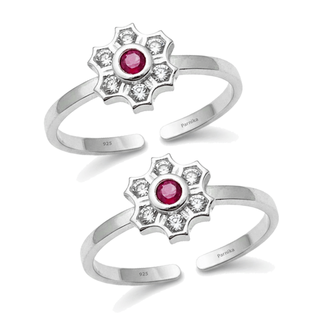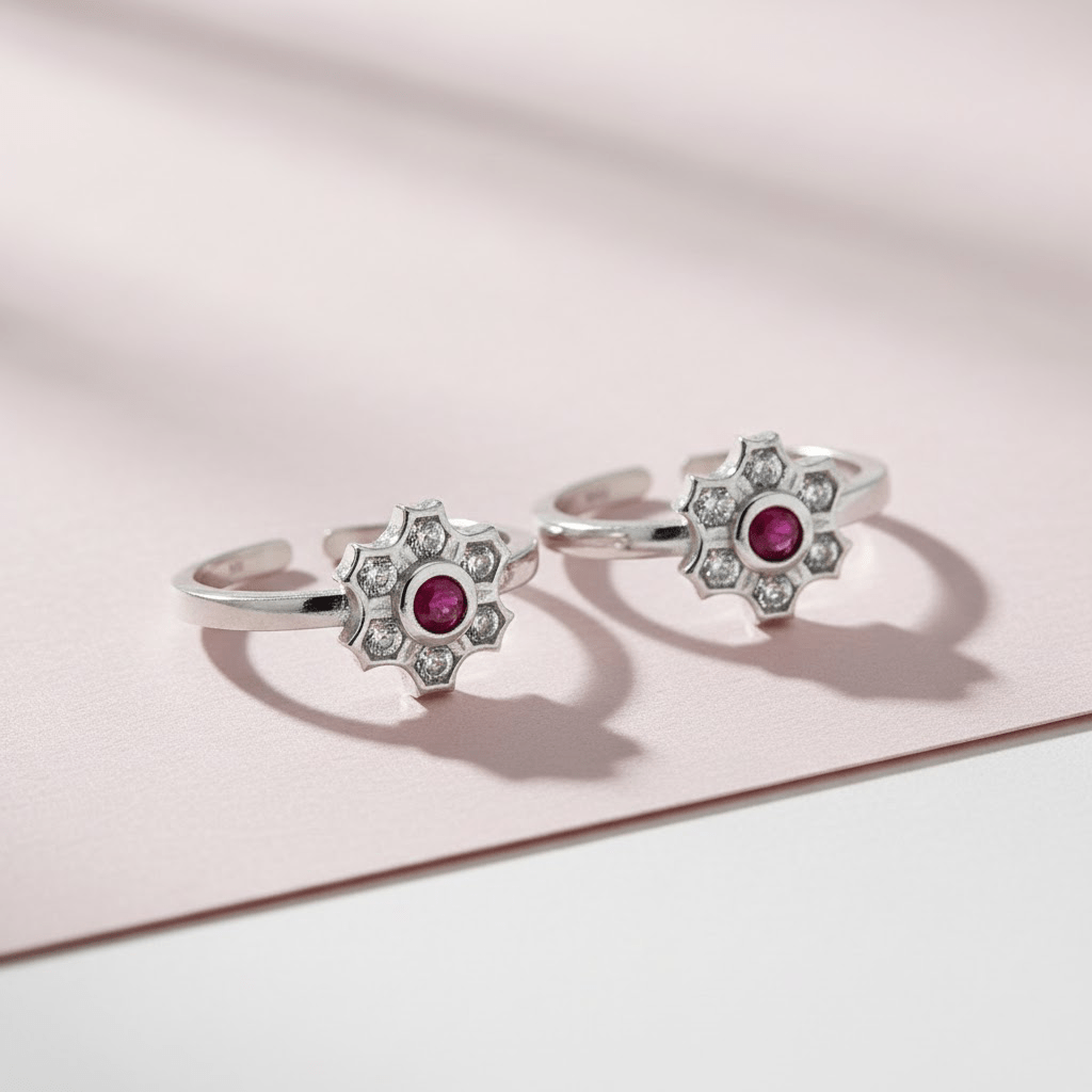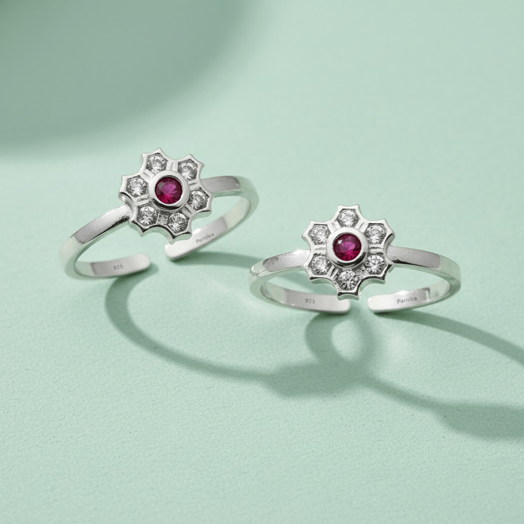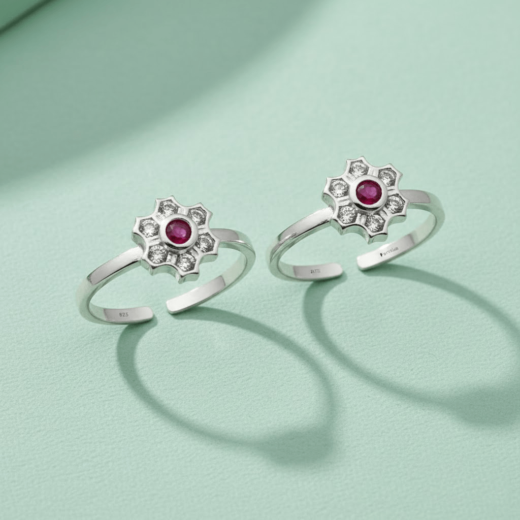 Floral dual tone toe rings are exquisite pieces that combine elegance with breathtaking design. These beautiful floral dual tone toe rings feature an elegant flower design with a vibrant ruby red center stone surrounded by sparkling white crystals in a delicate snowflake pattern. Perfect for adding a touch of graceful elegance to your festive or casual ensemble, these floral dual tone toe rings showcase superior craftsmanship. The adjustable open-toe design ensures a comfortable fit for all sizes. A timeless accessory that brings sophisticated charm and sparkle to your look.