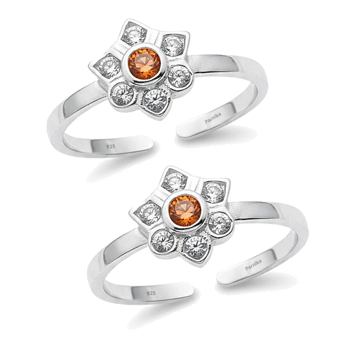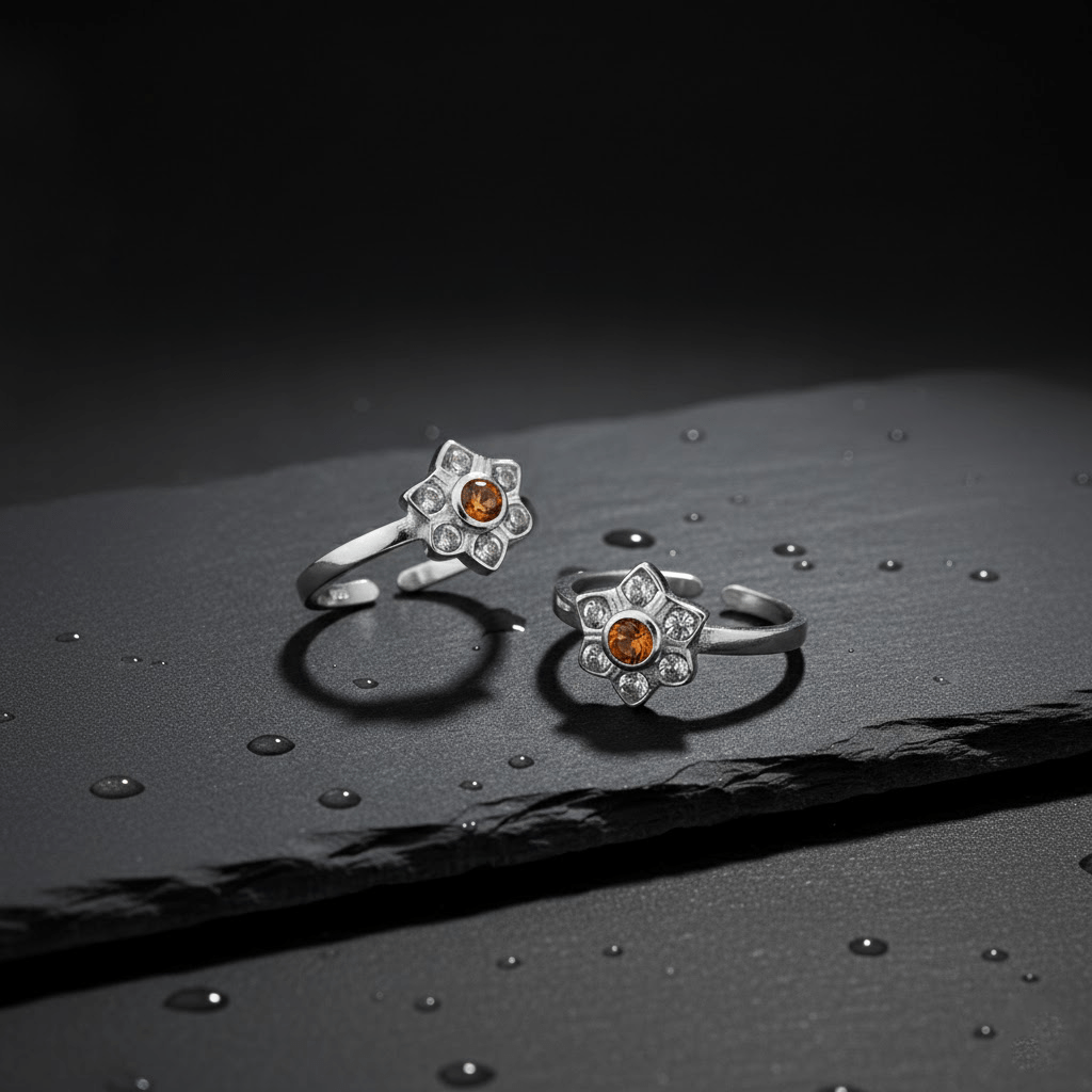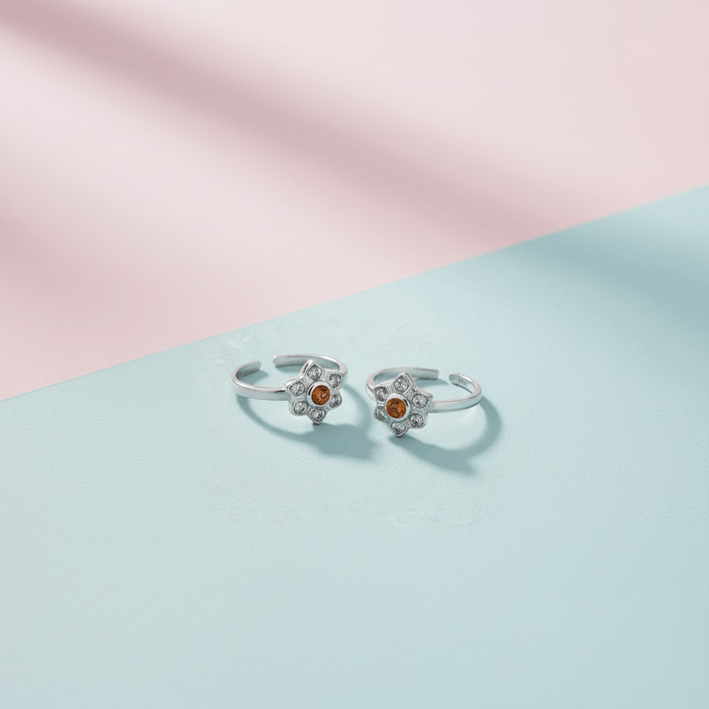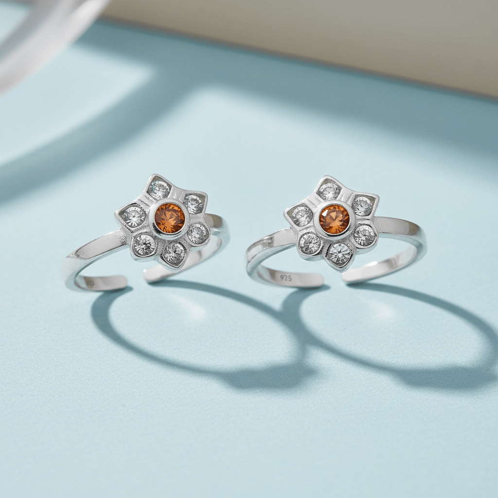 Elevate your toe ring collection with our stunning Floral Design Garnet CZ Toe Rings. Featuring an exquisite floral cluster design with a lustrous garnet stone as the centerpiece, surrounded by sparkling cubic zirconia (CZ) stones that catch the light beautifully.