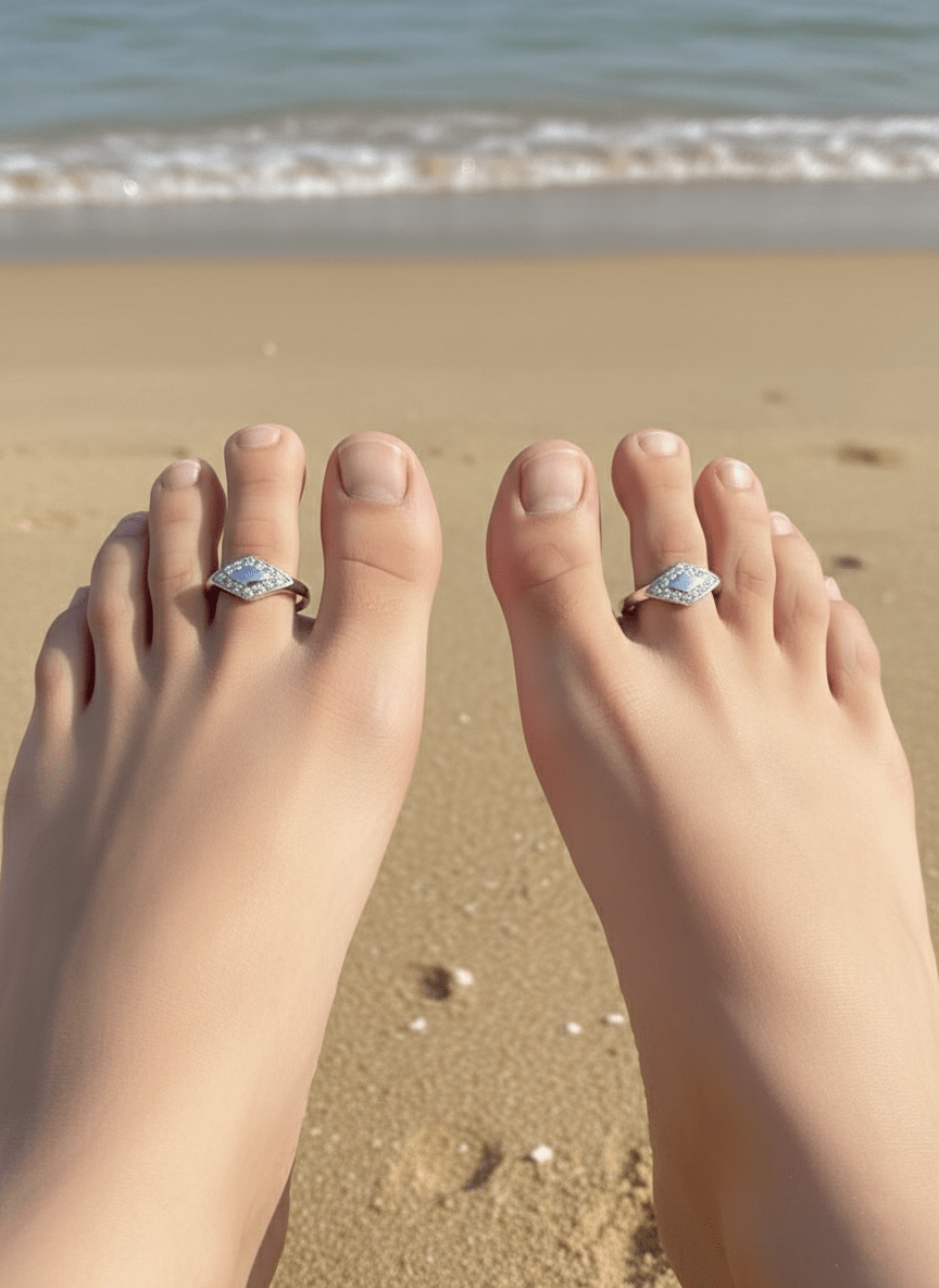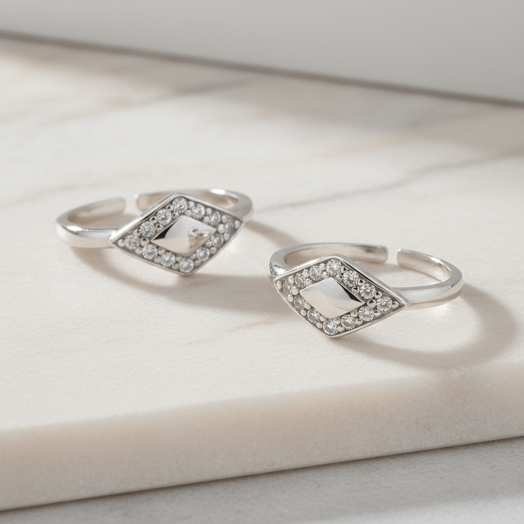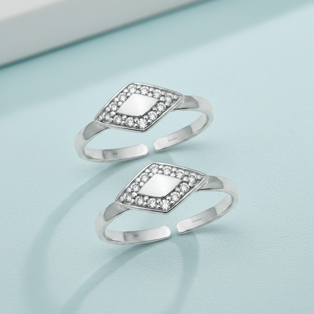 Our geometric square CZ toe ring combines contemporary design with timeless elegance. Each piece showcases meticulous craftsmanship with cubic zirconia stones arranged in a stunning square formation. The bezel setting provides exceptional sparkle and brilliance, making this toe ring a standout accessory. Whether for celebrations, weddings, anniversaries, or daily wear, this adjustable geometric square CZ toe ring offers both style and comfort. The adjustable design ensures a perfect fit for various toe sizes. Parnika Jewels specializes in high-quality cubic zirconia jewelry, offering beautiful designs at affordable prices. This geometric square CZ design is perfect for those seeking elegant foot jewelry that combines modern geometry with traditional beauty.