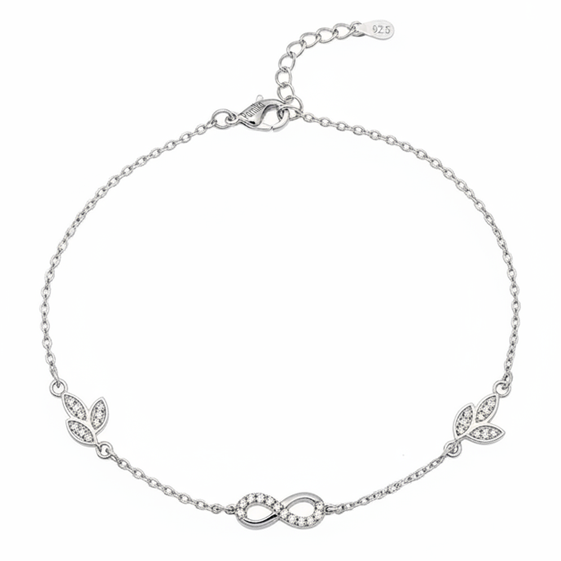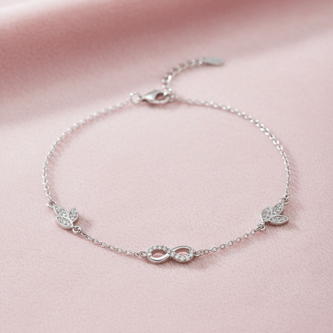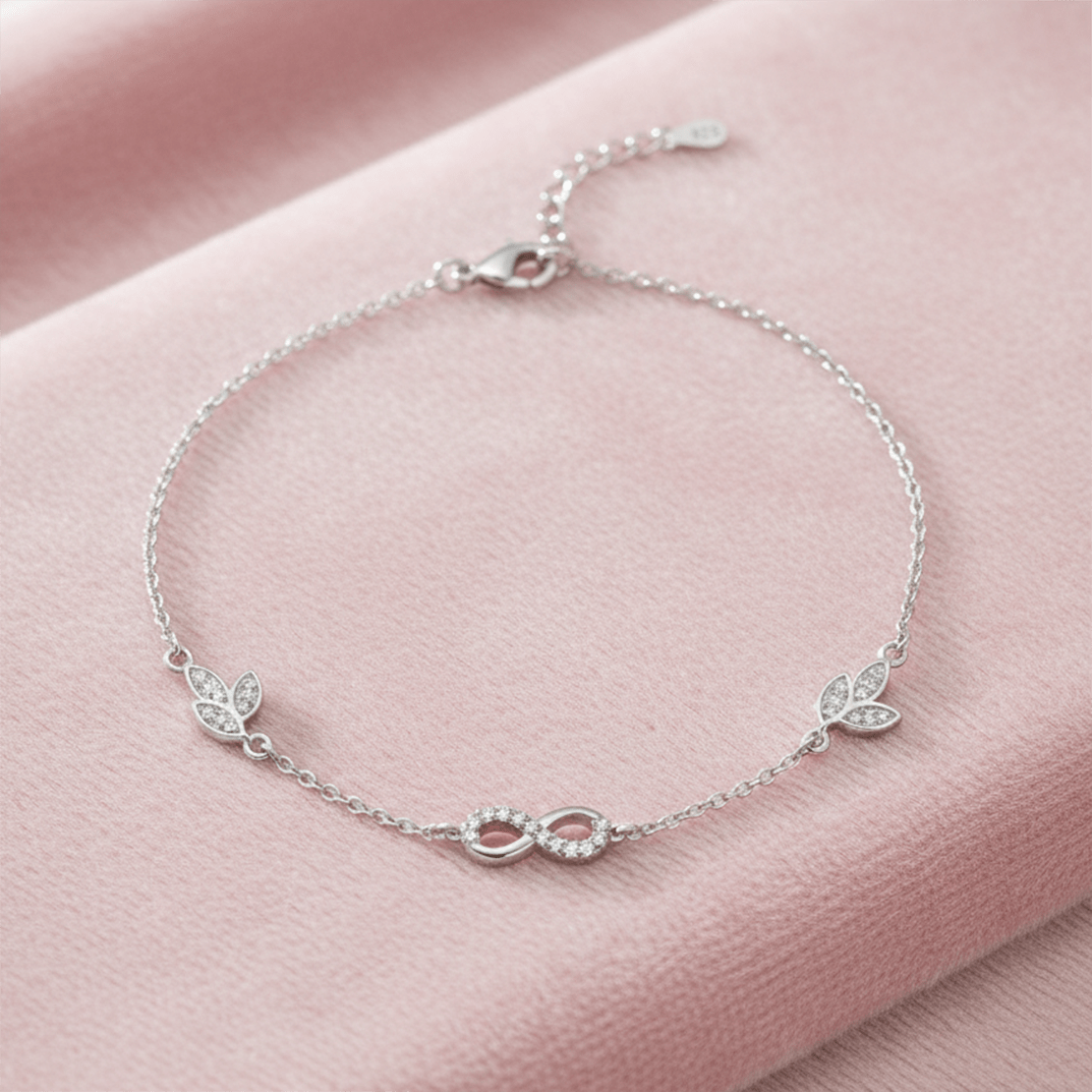 Infinity Leaf Bracelet – Elevate your accessory collection with this stunning Infinity Leaf CZ Halo Bracelet, a perfect blend of elegance and contemporary design. Featuring an iconic infinity symbol complemented by delicate leaf charm pendants adorned with sparkling CZ (cubic zirconia) halos, this bracelet brings a touch of sophistication to any outfit.
