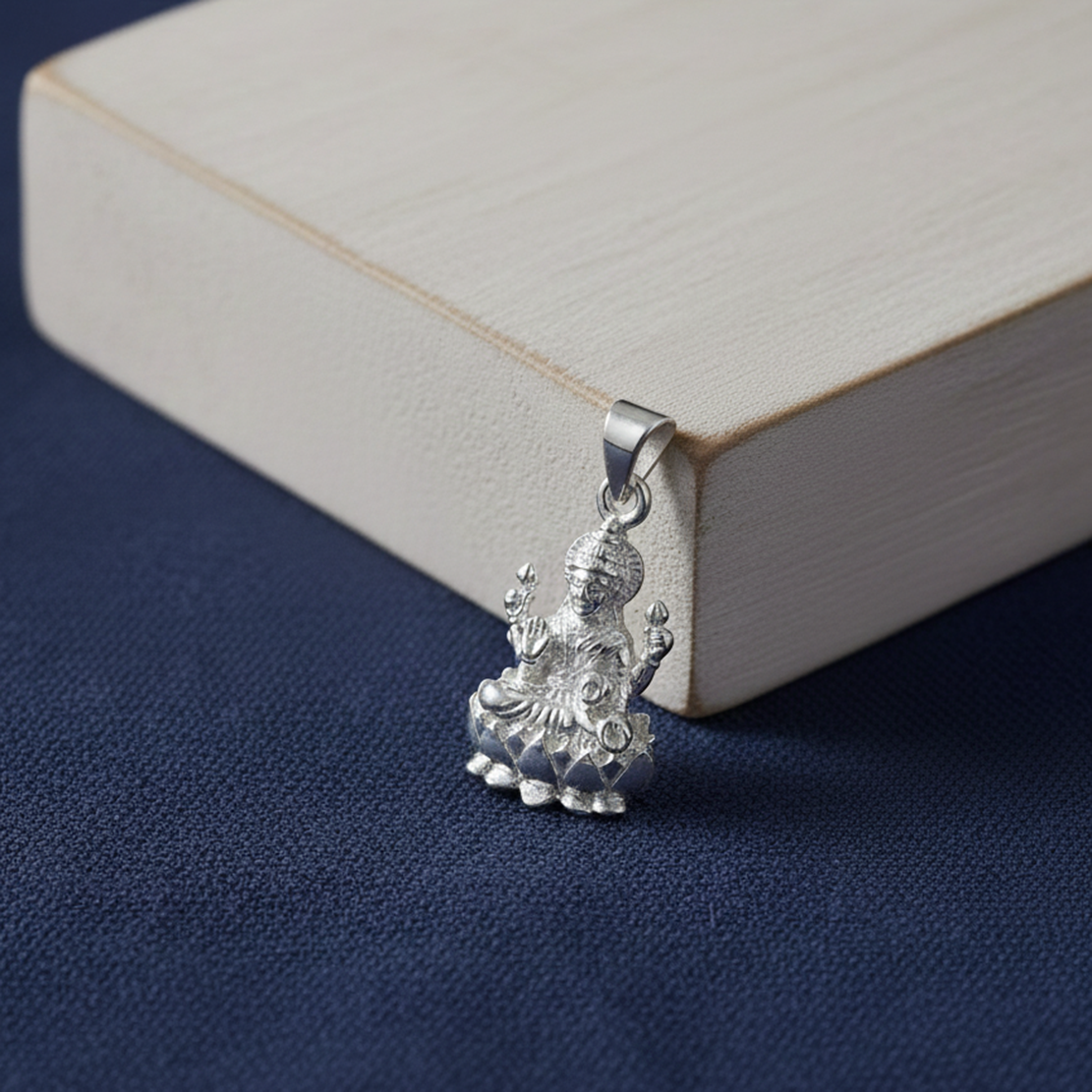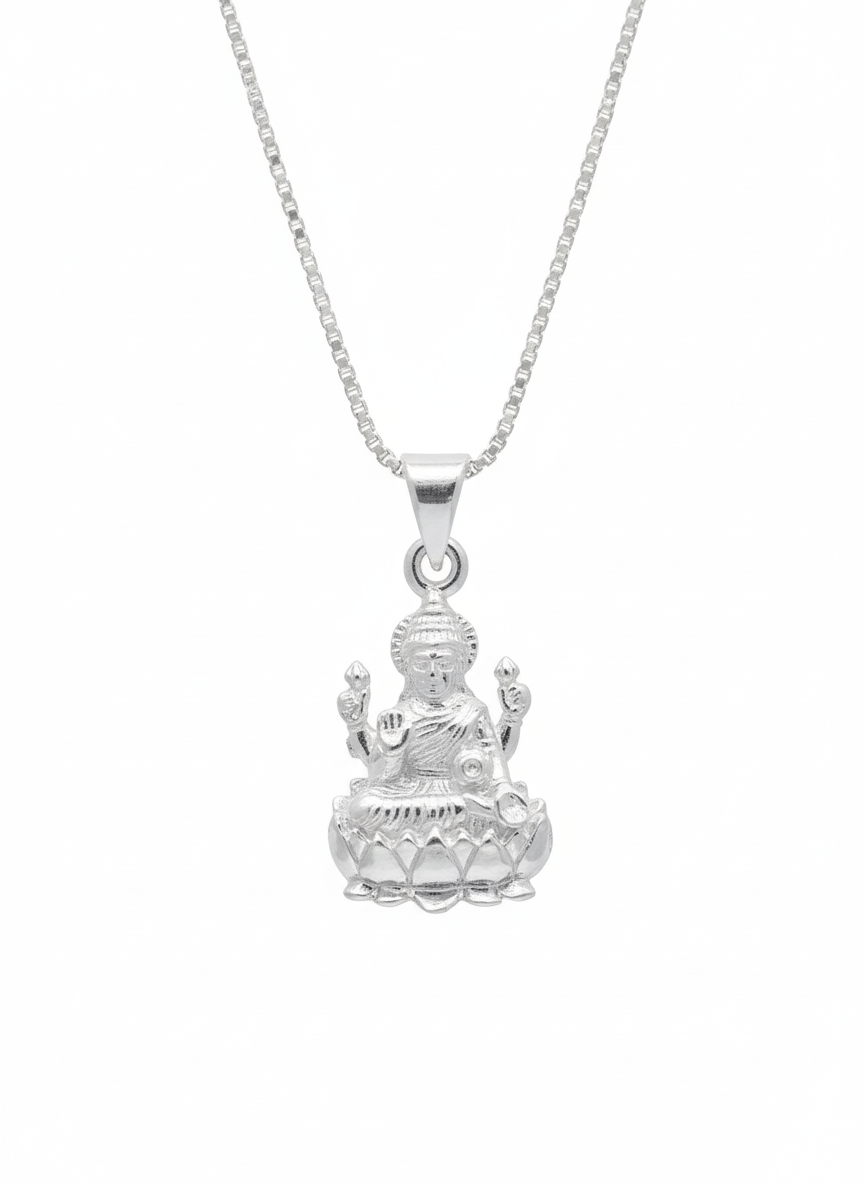 Lakshmi pendant silver – Our beautiful lakshmi pendant features an intricately carved goddess figurine seated gracefully on a lotus base. This divine lakshmi pendant showcases masterful craftsmanship with detailed engravings representing Lakshmi, the Hindu Goddess of wealth, prosperity, and abundance.