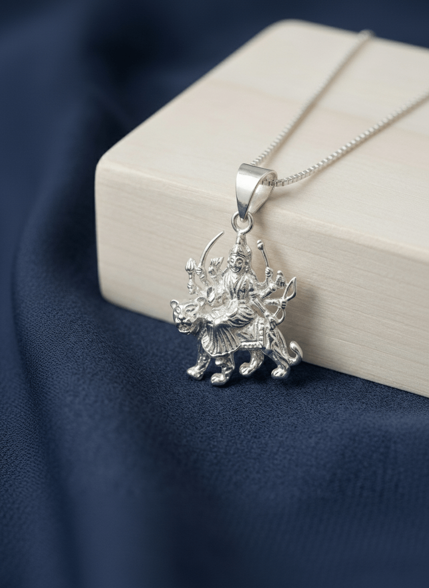 Exquisite Sherawali Mata pendant featuring the powerful multi-armed Hindu goddess seated gracefully on a majestic lion. This stunning spiritual pendant captures the divine essence of Durga (Sherawali) with intricate detailing and traditional craftsmanship.