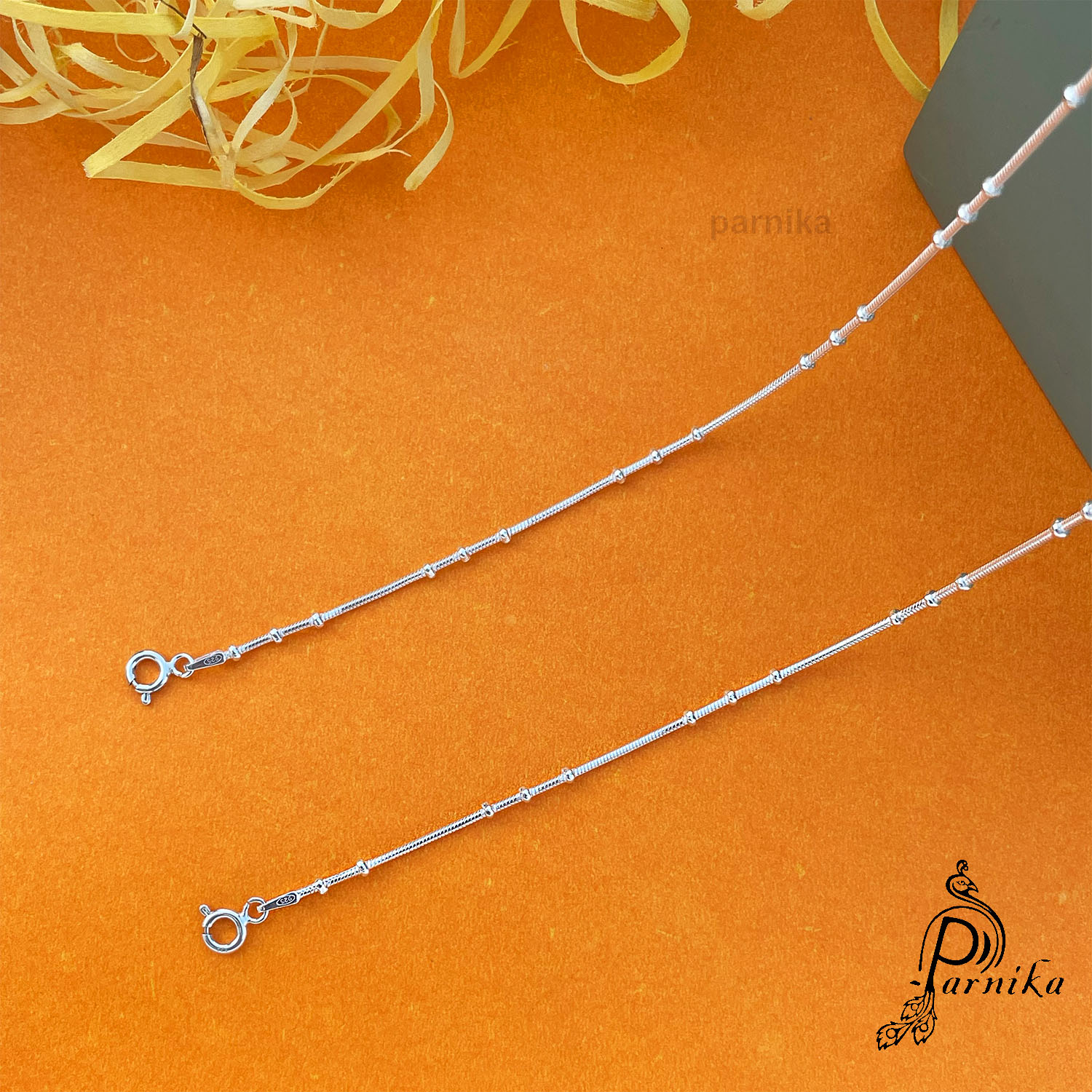Sleek Snake Chain Silver Payal Design (Anklets) – a modern and captivating accessory that draws inspiration from the fluidity and allure of snake chains. Elevate your style with these anklets, designed to make a bold statement with their sleek and contemporary design.