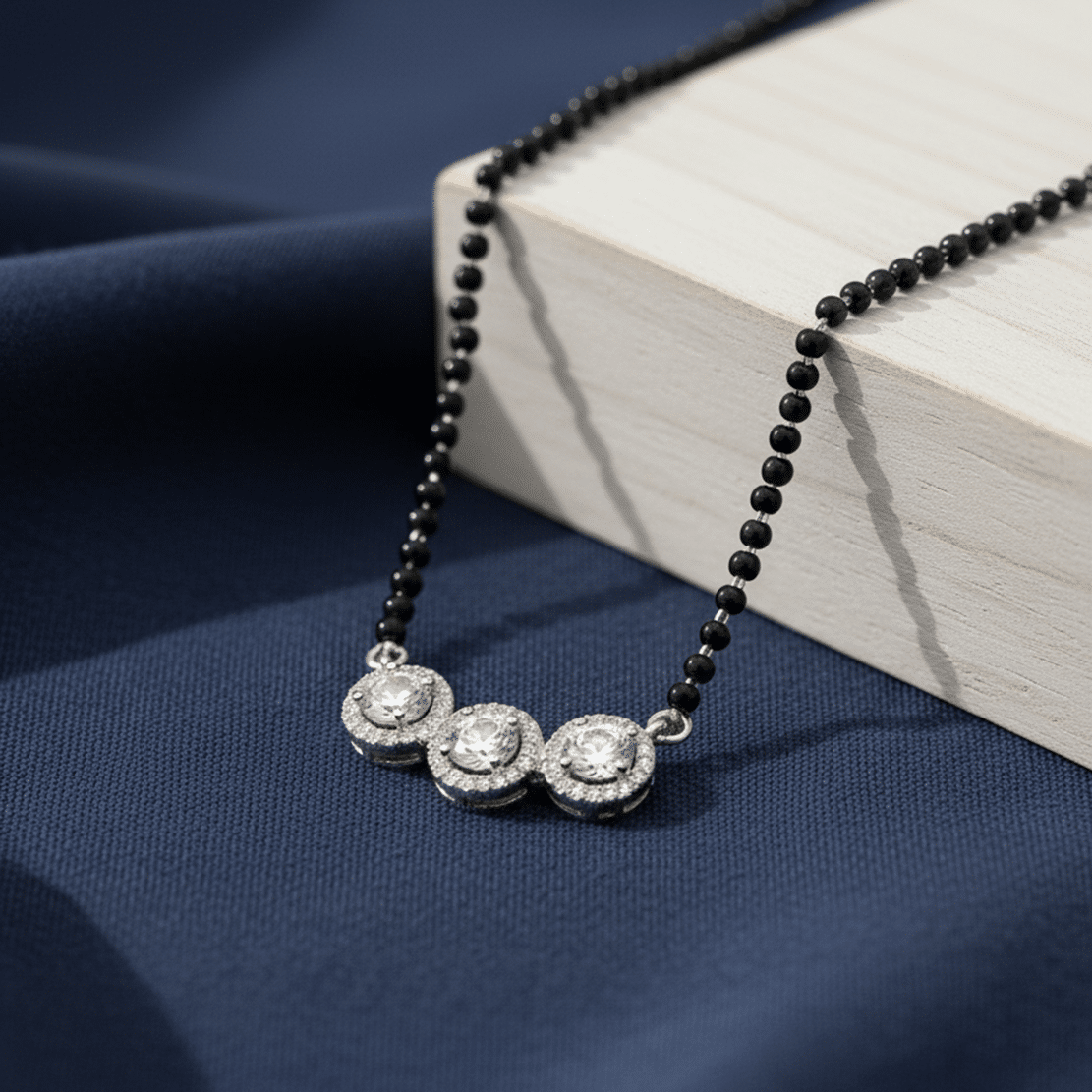 Each CZ circle pendant is precisely cut to sparkle brilliantly, catching light from every angle for a dazzling effect. The cubic zirconia stones are individually set in sterling silver to ensure durability and longevity. The black beaded chain complements the radiant CZ pendants perfectly, creating a striking contrast that makes this mangalsutra necklace truly eye-catching.